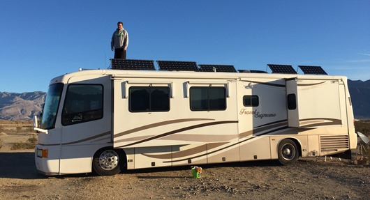 The panels are attached to metal frames bolted to the top of Scoopy. They lay flat when we travel (duh) and when we're parked and the sun is high in the sky, like, say, summer. Or we can tilt them when the sun is low in the sky, like in winter. Now, when I say "we" tilt them, I mean that in the royal sense. Steven does all the climbing on Scoopy's roof. It would be awesome if tilting was as easy as simply pushing a button, but it's not, tilting is a manual process. The panels can tilt either way, but our best direction is to the left, or the driver's side. Panels don't work so well if there is a shadow over them and our AC units can throw some shade if the panels are pointed to the right. So ideally, in the winter, we want to orient Scoopy to the west (which means our panels are tilted south) and in the summer, it doesn't really matter as long as there is open sky. Got all that? It took me a while. In fact, the very first time we parked to test out our solar in Colorado, the first place we picked out had a ton of shade. Once we realized our mistake, we had to move. What noobs!